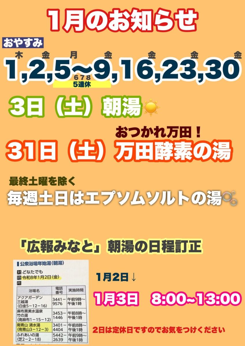 INFOMATION あけましておめでとうございます🎍🫧 Posted 2026年1月1日2026年1月1日 shimizuyu 明けましておめでとうございます🎊本年も宜しくお願いいたします😀 『広報みなと』に朝湯の日程が間違っていましたのでその訂正も含めて、1月のご案内です。 重要コインランドリー休業の日1/23(金)乾燥機交換のため、お休みさせていただきます。お客様にはご不便をおかけして申し訳ございませんが、ご了承ください。